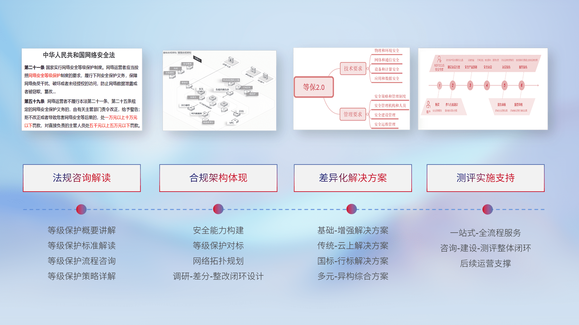 通过专业的法律咨询解读、、、、合规架构体现、、、差异化解决方案、、、、测试实施支持等服务,,,为客户量身打造等保合规体系。。。